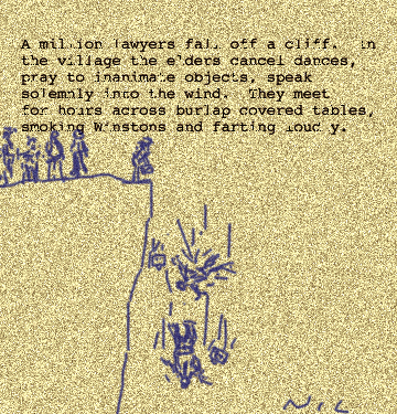 A million lawyers fall off a cliff. In the village the elders cancel dances,