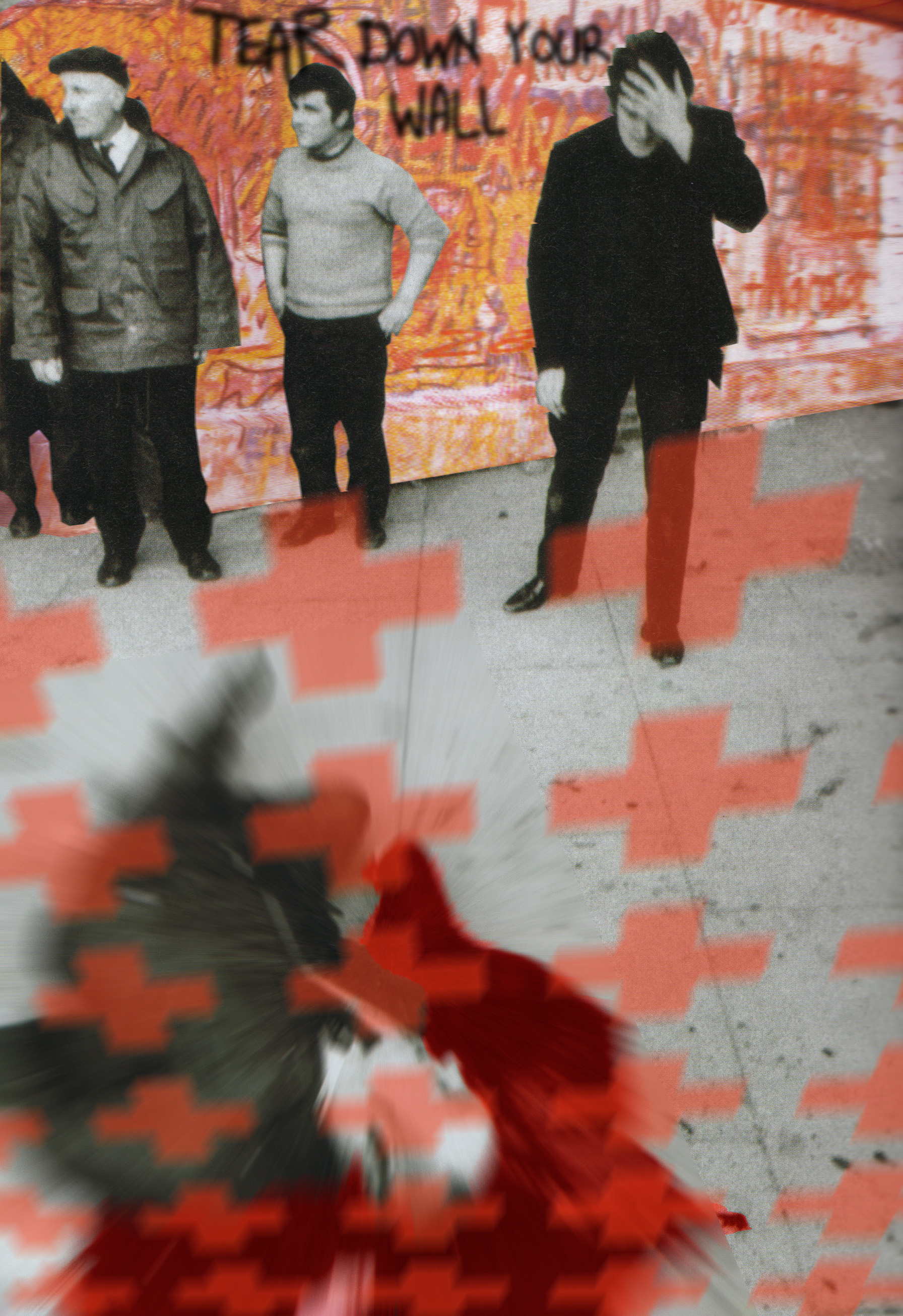 "Tear down your wall" is created to remind us of our own psychological obstacles and mental barriers. These "walls" often unknowingly manifest and surface when we are faced with a situation. The strength of "these walls" is stronger than any real physical walls that are created to separate people or spaces. The digital image uses images from the Berlin Wall, a scene with a dying man and an imaginary wall of crosses. It tries to contextually montage three images to communicate with its viewers. Its tone of seriousness and severity is also a reflection of how people in today's highly mobile and fast-paced world are more concern with their own desires and needs that they often neglect what is happening around them.
