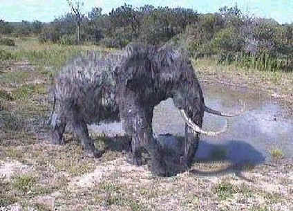 First, it looks like a typical African elephant with some smudged texture on it to make it appear woolly.