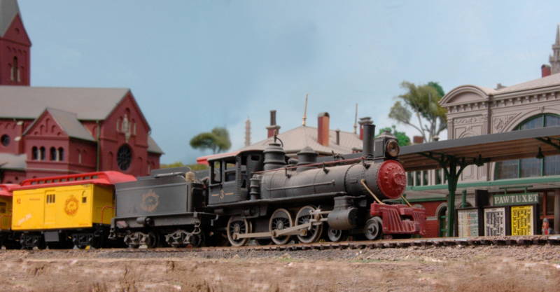 A scene from the late 1880s: Old no. 3 pulls two coaches and a baggage car in the brigbt AP&G livery into Pawtuxet central Station.