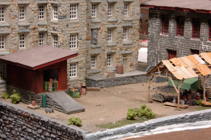 This scene began more than 25 years ago when I built a Magnusson resin kit of a brewery. This mill complex was inspired by South River Models brilliant limited-editions kits of New England water-powered mills. By the time I discovered them, those I anted were gone, and I decided to use their excellent on-site photographs to see if I could build something like them. To the brewery I added a mill or warehouse from one of Ed Fulacz's hydrocal cast kits — I believe he stopped selling them a few years ago — and an RDA hydrocal kit I purchased on EBay in 2006 or 2007. I built a clerestory roof with windows out of styrene sheet and windows from Grandt Line or Tichy and then cut out a hole in the wall of the middle building and ran a bridge between it and the brewery, to which I also added a projecting third from on the left, something I had seen in some New England mills. I then build a set of beams from basswood to support that part of the middle building which projects over the pond. The dam release gate, which is not yet complete, was build from a piece of oak, various pieces of styrene, wire, and a Scale Structures wheel.