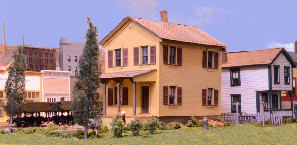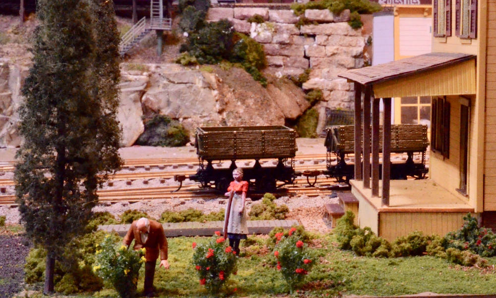 Old Mr. Johnson checks his rosebushes while the housekeeper looks on. The building is a B.T.S. kit, several of whose rooms are furnished and illuminated. Click on image to enlarge it.