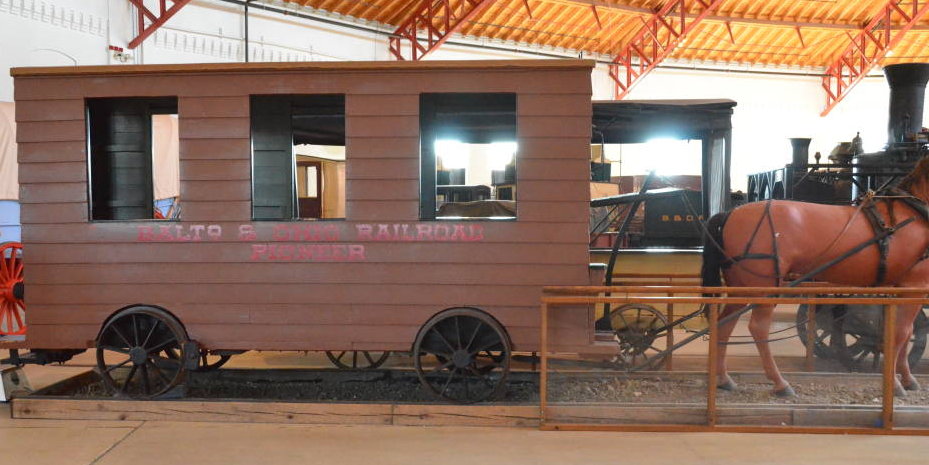 Modern replica of a B&O horse-drawn car on rails. Baltimore & Ohio Railroad Museum