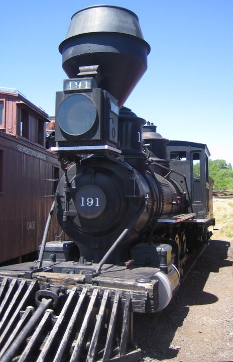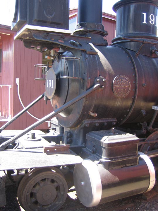Denver Leadville & Gunnison Railroad Engine 191 2-8-0. 1880 Baldwin Locomotive Works no. 4919. 191, which is the oldest locomotive in the state, was built originally for the Denver South Park & Pacific, sold to the Wisconsin Lumber Co. in 1902, and returned to Colorado by the museum in 1972. Click on images to enlarge them.