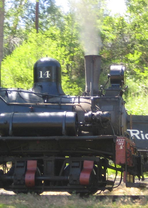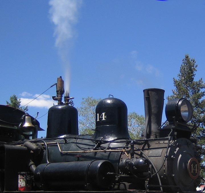 The steam dome of Argentine Central Class C Shay as the engineer releases steam. Note some interesting details, including the loco's paint job: the matte gunmetal gray smokestack and front portion of the boiler; bare metal (?) piping, number plate, and can of what looks like grease near the cab/ [Click on images to enlarge them.]