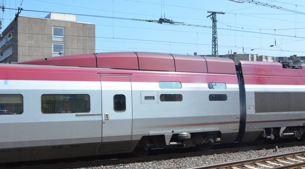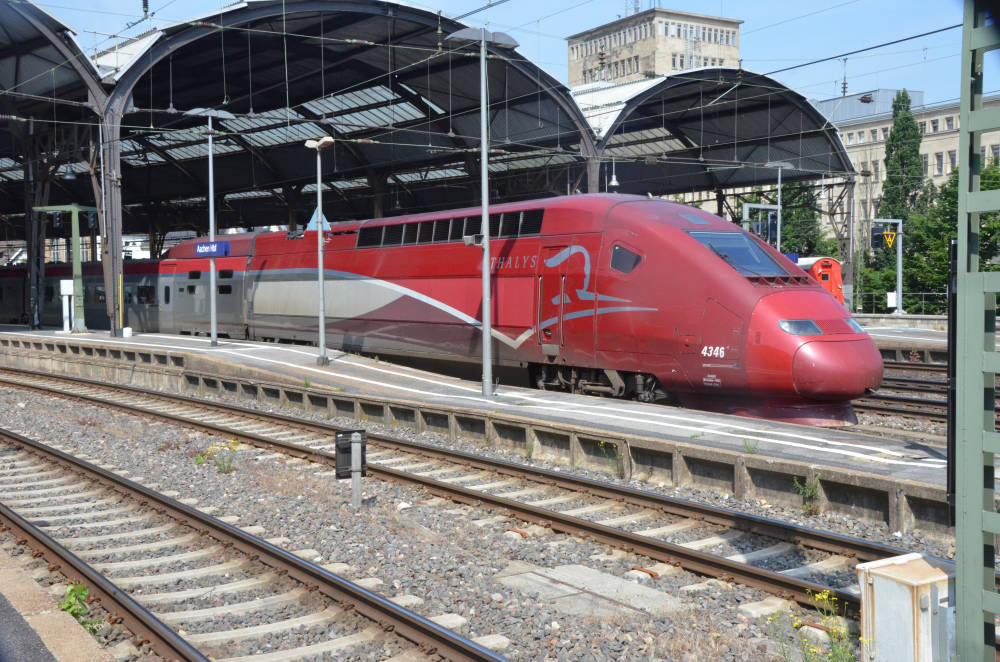 Thalys pulls out of the station at Aachen heading to Frankfurt. July 2013. We were lucky that we had tickets on the DB ICE to Frankfurt rather than on this train, since we had two additional connections to make and, as the train board in the station pointed out, this one was three hours late and the one following an hour late! The locomotive is considerably higher than the passenger cars it pulls, so the car next to the engine has a cowling to make a better visual transition and to create streamlining. [Click on these images to enlarge them. Press the next links for other views]