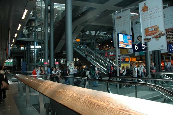Interior at ground level of the Berlin Hapuptbahnhof (Main Station). The station hosts not only the ICE highspeed express trains, regionals, and locals but also the S-Bahn and U-bahn — metropolitan underground and elevated trains as well. [Click on these images to enlarge them. Press the next links for other views]